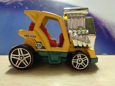 Here is a look at the Hot Wheels model Tee'd Off 2. This model can be found in the HW Tool-in-1 mini collection for the 2016 mainline. This model sports a yellow paint scheme along with HW Golf Club decals. When a golf ball is placed on top of the golf cart's motor, this vehicle can be used as a golf tee.